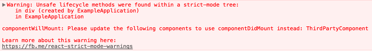 当启用严格模式时,React 会列出使用了不安全生命周期方法的所有 class 组件,并打印一条包含这些组件信息的警告消息,如下所示: